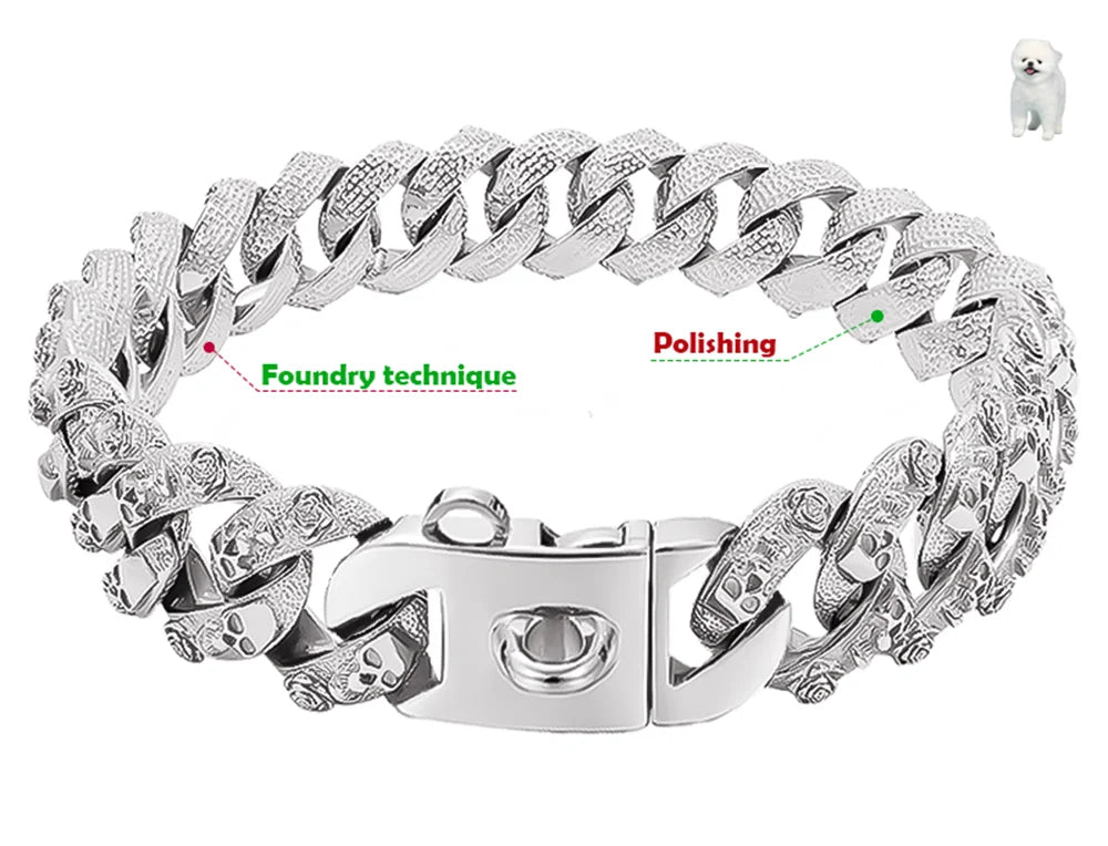 Designed by Dog Paw Clothing, the AlphaLux Steel Collar™ blends statement-making style with functional strength. The durable stainless steel links resist wear and corrosion, making it suitable for daily walks, training sessions, and controlled outings.