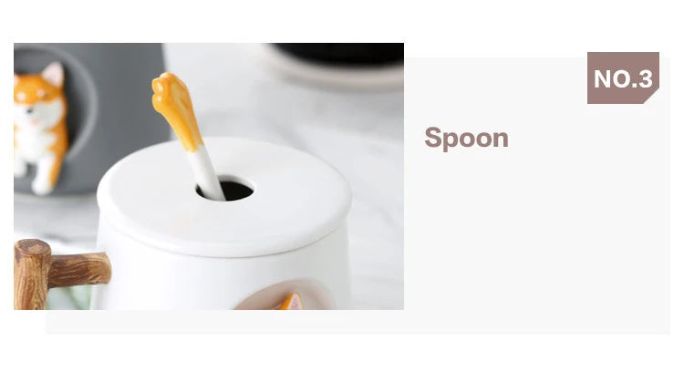 Kawaii Cute 3D Ceramic Cartoon Shiba Dog Coffee Mug Teacher Appreciation Gifts, 420ML Tea Cup with Wood Handles for Office,Home